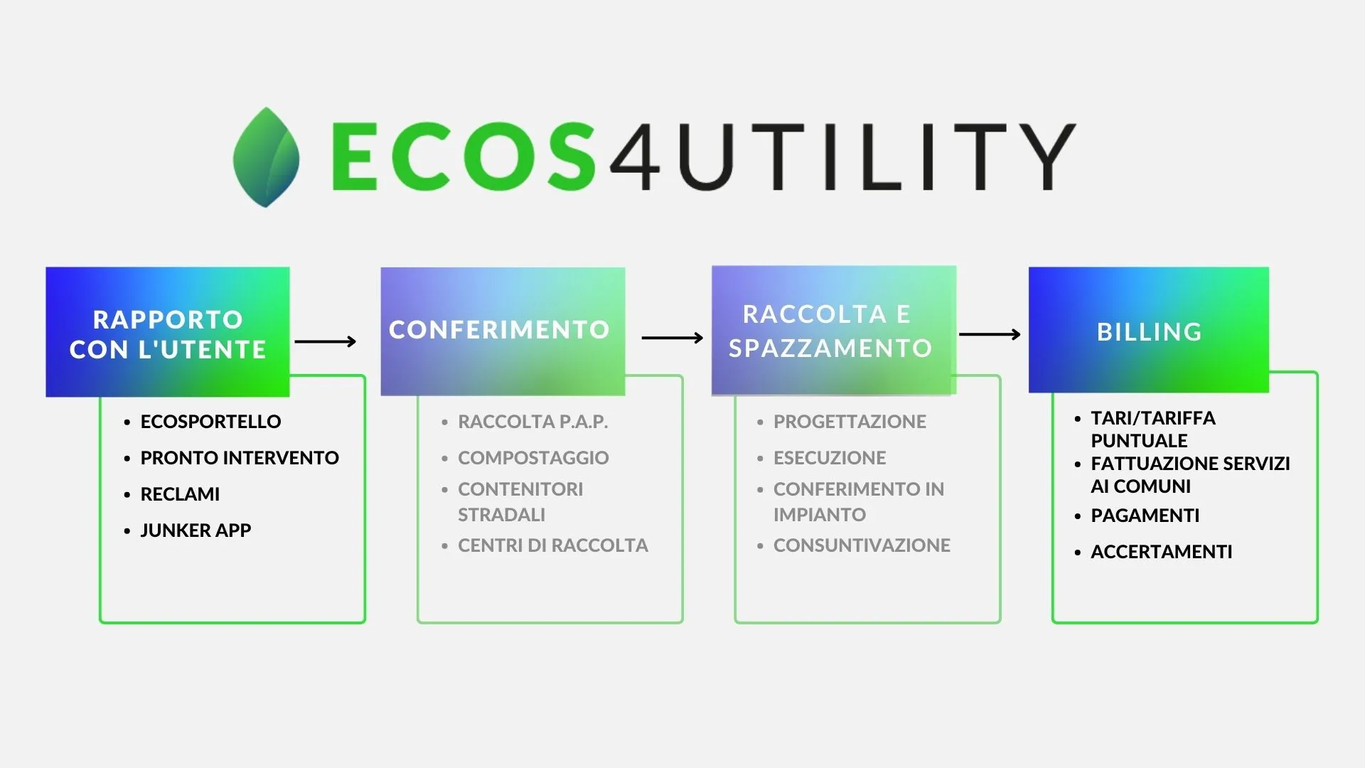 Attraverso ECOS4UTILITY e TREG è possibile gestire tutte le fasi di contatto del rapporto con gli utenti attraverso molteplici canali di comunicazione e l’attività di tariffazione in tutte le modalità (TARI, TARIP, TARIC) fino al processo di gestione del rapporto con l’ARERA.